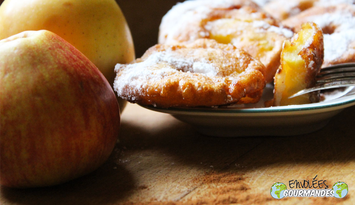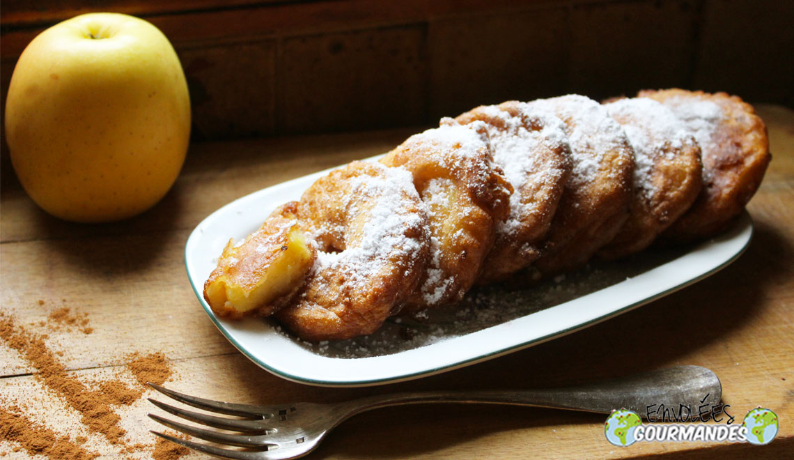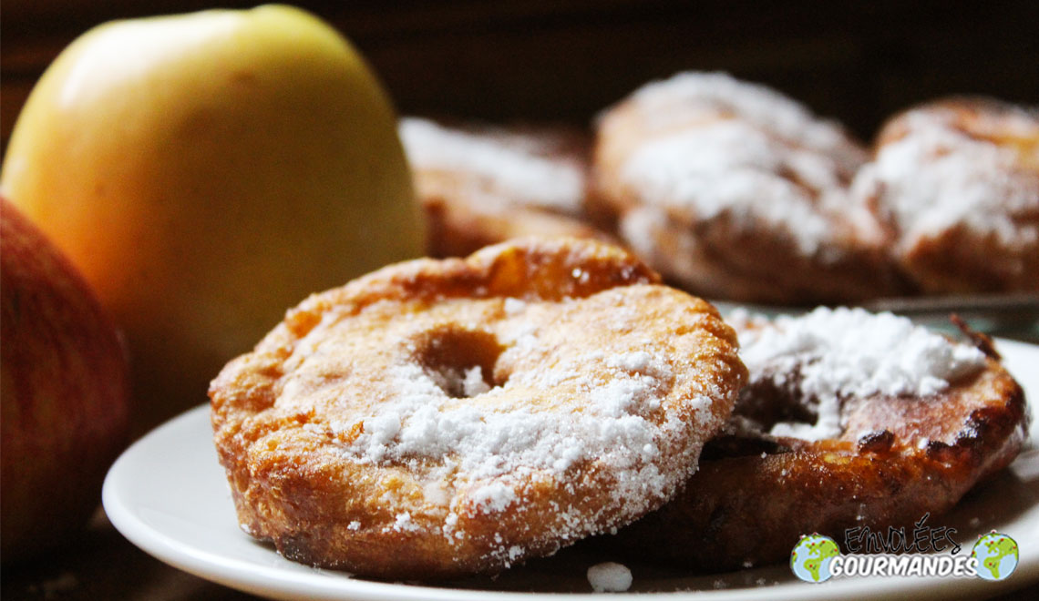 – Plonger les morceaux de pommes dans la pâte, les égoutter au maximum, puis les plonger dans l’huile chaude (les beignets doivent cuire sans brûler)
