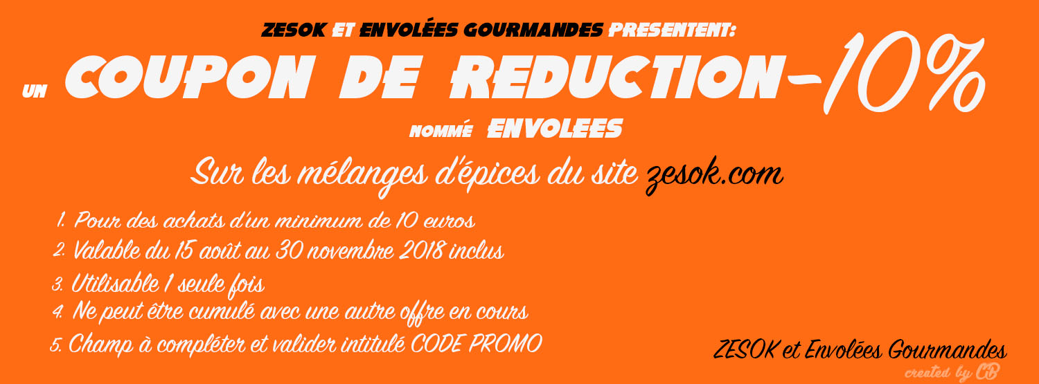 Pour rappel, ZESOK, une belle marque d’épicerie fine africaine (dont le fondateur vit en Allemagne) et Envolées Gourmandes ont noué au mois d’août dernier, un partenariat pour quelques mois. Vous pouvez encore bénéficier de la remise de 10% sur vos achats, à laquelle vous avez droit avec le code ENVOLEES. L’offre est valable jusqu’au 30 novembre 2018 inclus. Prendre connaissance de  l’histoire de cette petite marque qui rêve grand ci-contre https://www.envoleesgourmandes.com/2018/08/poulet-au-pied-leve-cuisses-de-poulet-zesok-au-four/