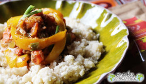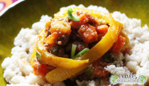 –Verser ensuite le coulis de tomates,  parsemer de cive ou de ciboulette, saler et laisser sur le feu à nouveau 3 minutes. Rectifier l’assaisonnement et servir chaud, la préparation joliment dressée sur le gari…